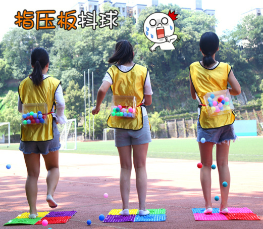 团队的小伙伴,站在指压板上,跟随音乐,抖动身体,将球从盒子中抖出,没一个回合选6人,共计5个回合,小组每人只能参加一次,在规定的时间内按照抖球的多少决定排名,球越多,排名越前。